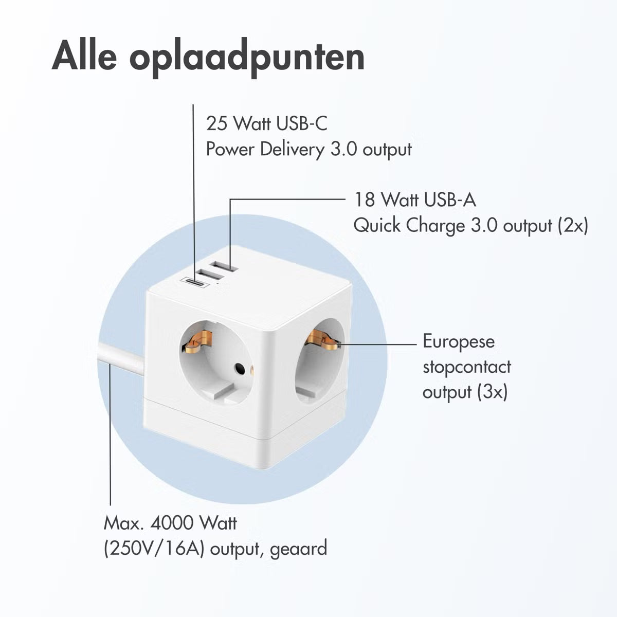 Waarom de Accezz PowerCube Strip | 6-in-1 - 1x USB-C + 2x USB-A + 3x stopcontact - 4000 watt?